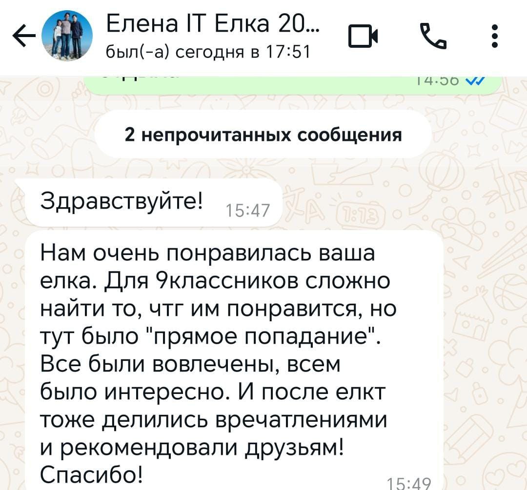Здравствуйте! Нам очень понравилась ваша елка. Для 9классников сложно найти то, что им понравится, но тут было "прямое попадание". Все были вовлечены, всем было интересно. И после елки тоже делились впечатлениями и рекомендовали друзьям! Спасибо!