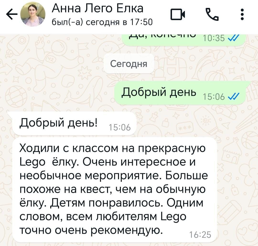 Добрый день! Ходили с классом на прекрасную Lego ёлку. Очень интересное и необычное мероприятие. Больше похоже на квест, чем на обычную ёлку. Детям понравилось. Одним словом, всем любителям Lego точно очень рекомендую.