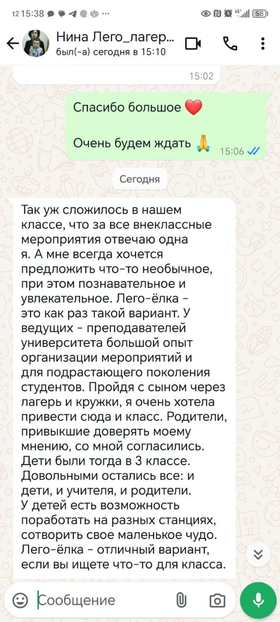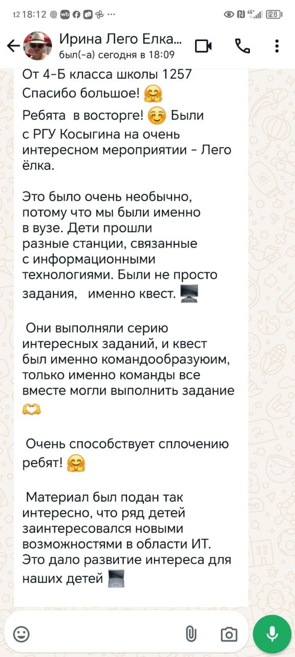 От 4-Б класса школы 1257 Спасибо большое! Ребята в восторге! Были с РГУ Косыгина на очень интересном мероприятии - Лего ёлка. Это было очень необычно, потому что мы были именно в вузе. Дети прошли разные станции, связанные с информационными технологиями. Были не просто задания, именно квест. Они выполняли серию интересных заданий, и квест был именно командообразующим, только именно команды все вместе могли выполнить задание. Очень способствует сплочению ребят! Материал был подан так интересно, что ряд детей заинтересовался новыми возможностями в области ИТ. Это дало развитие интереса для наших детей
