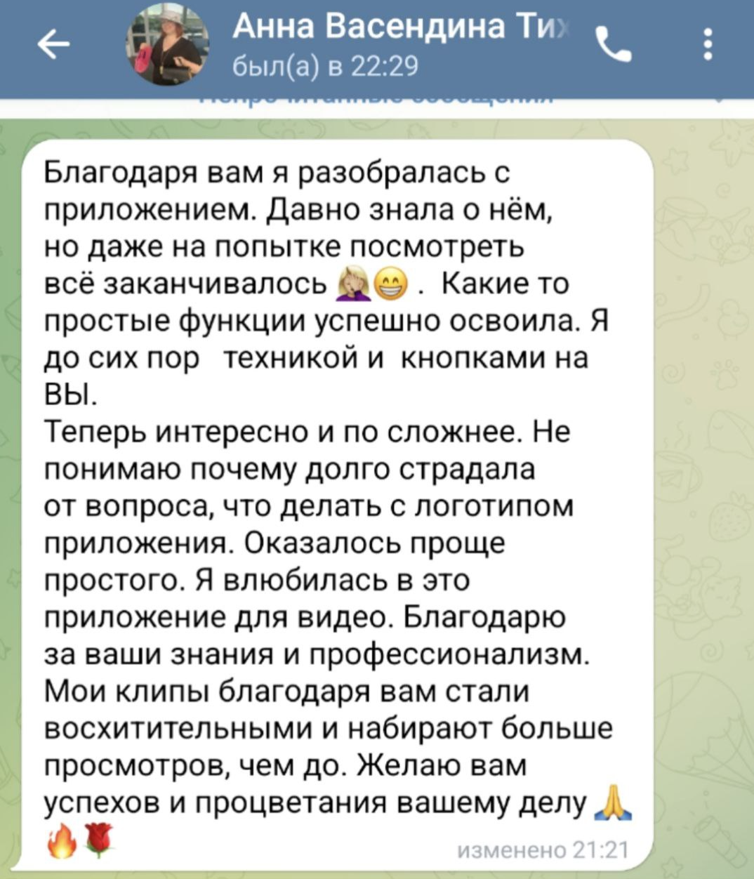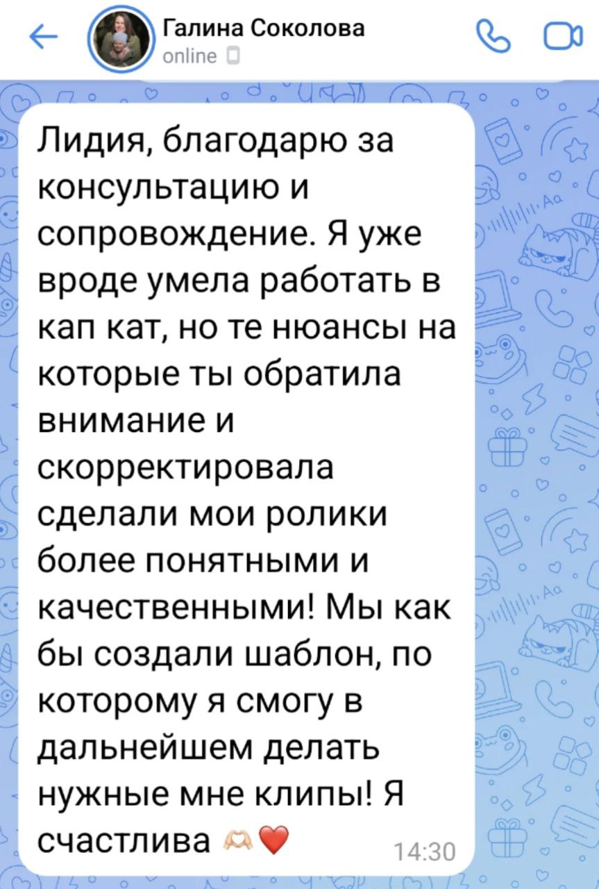 Лидия, благодарю за консультацию и сопровождение. Я уже вроде умела работать в кап кат, но те нюансы на которые ты обратила внимание и скорректировала сделали мои ролики более понятными и качественными! Мы как бы создали шаблон, по которому я смогу в дальнейшем делать нужные мне клипы! Я счастлива.