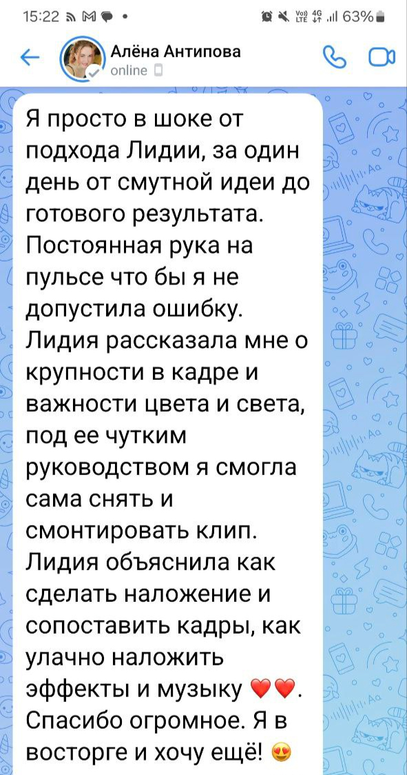 Я просто в шоке от подхода Лидии, за один день от смутной идеи до готового результата. Постоянная рука на пульсе что бы я не допустила ошибку. Лидия рассказала мне о крупности в кадре и важности цвета и света, под ее чутким руководством я смогла сама снять и смонтировать клип. Лидия объяснила как сделать наложение и сопоставить кадры, как улачно наложить эффекты и музыку